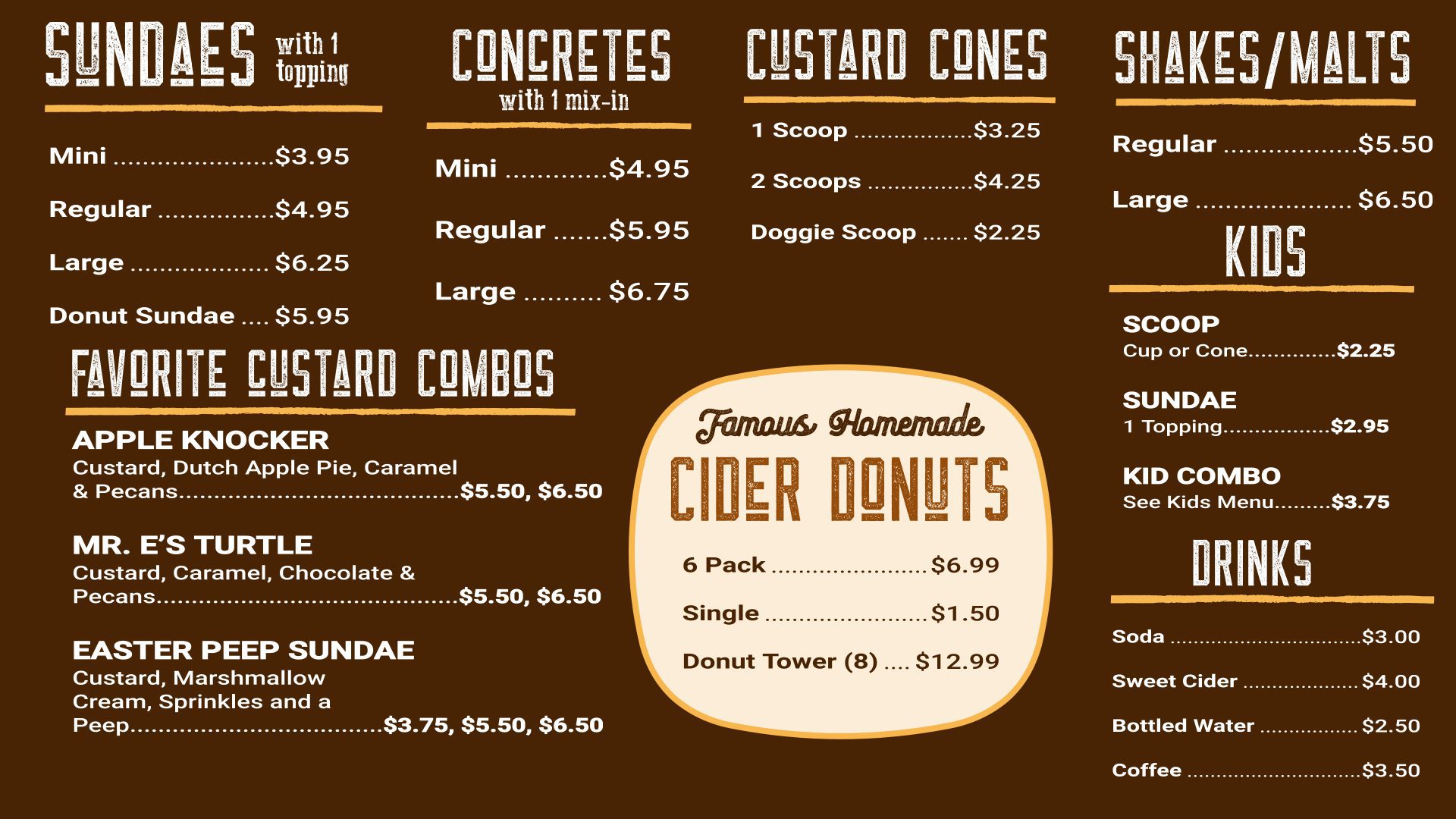 Peanut butter cup, M&M, Heath, Sprinkles, Gummy Worms, Sprinkles, Strawberry, Dutch apple pie, Pineapple, Banana, Cherry, Peach (summer), Blackberry (summer), Oreo, Cookie Dough, Brownie, Hot Fudge, Caramel, Pecans, Chocolate Chips Marshmallow, Peanuts, Chocolate Syrup, Coconut, Whipped Cream