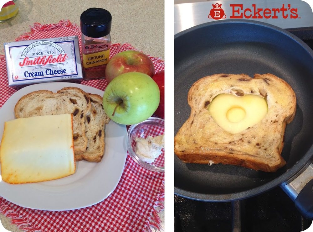 Mix cream cheese, powdered sugar, and cinnamon. Spread on one piece of raisin bread. Top with apple slice and cheese. In remaining piece of bread, cut out a heart using a 2-inch heart cookie cutter. Place that slice of bread on top of cheese. Preheat and butter a non-stick griddle. Toast sandwich on both sides until golden brown and cheese is melted. Makes 1 serving.